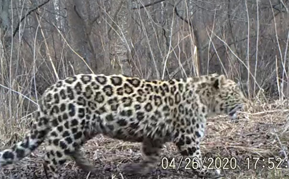 视频的拍摄时间是4月26日17点52分,地点在天桥岭林业局新开林场辖区。黄昏的山林中,一只东北豹从镜头前从容地走过,身上的铜钱状的花纹清晰美丽。