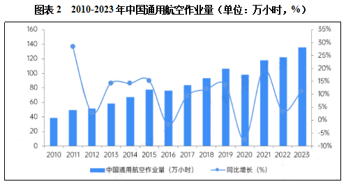 2010-2019年,我国通用航空业作业量整体呈增长态势。2020年受全球新冠疫情对航空业的影响,中国通用航空年作业量为98.4万小时,同比下降7.6%。2023年,中国通用航空作业量为135.7万小时,较2022年增长11.3%。