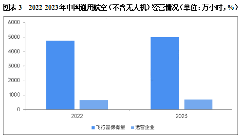 截至2023年底,我国通用航空飞行器(不含无人机)保有量约为5000架,比2022年增长5%。传统通用航空运营企业(不含无人机)690家,比2022年增长4%。