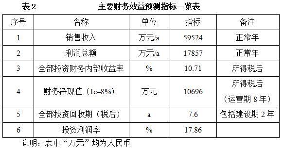 项目达产后,年销售收入59524万元,利润17857万元,投资回收期7.6年(税后,含建设期2年),投资利润率17.86%。
