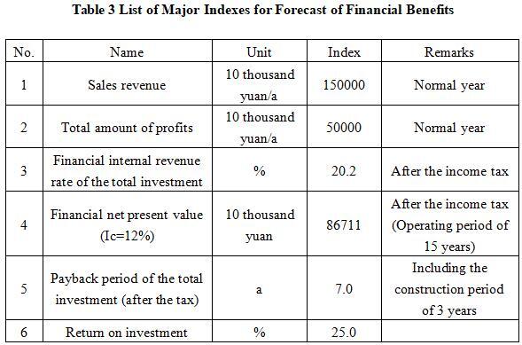 After the project reaches the production capacity, its annual sales revenue will be 1.5 billion yuan, its profit will be 500 million yuan, its investment payback period will be 7.0 years (after the tax, including the construction period of 3 years) and its return on investment will be 25.0%.