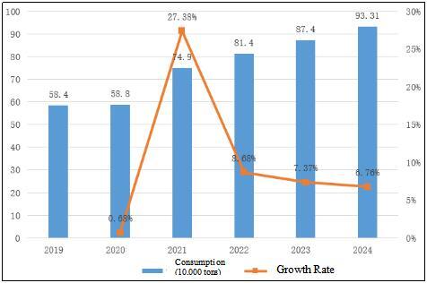 Figure 4Consumption and Growth Rate of Graphite Electrodes in China during 2019- 2024