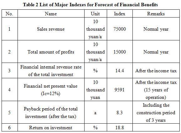 After the project reaches the production capacity, its annual sales revenue will be 750 million yuan, its profit will be 150 million yuan, its investment payback period will be 8.3 years (after the tax, including the construction period of 3 years), and its return on investment will be 18.8%.