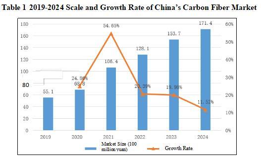 The overall scale of China’s carbon fiber market is on the rise. The market size of carbon fiber in China in 2019 was 5.51 billion yuan. Since then, it has been increasing year by year, reaching 6.88 billion yuan in 2020, 10.64 billion yuan in 2021, 12.81 billion yuan in 2022, and 15.37 billion yuan in 2023, the market size was 17.14 billion yuan by 2024.