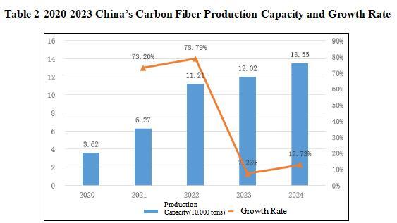 In 2020, China’s carbon fiber production capacity was 36,200 tons, reaching 62,700 tons in 2021, 112,100 tons in 2022, 120,200 tons in 2023, and reached 135,500 tons in 2024. The overall carbon fiber production capacity in China is on the rise, and with the continuous improvement of production capacity, more products was provided to the market.