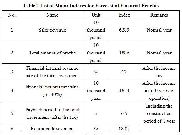 After the project reaches the production capacity, its annual sales revenue will be 62.89 million yuan, its profit will be 18.86 million yuan, its investment payback period will be 6.5 years (after the tax, including the construction period of 1 year) and its return on investment will be 18.87%.