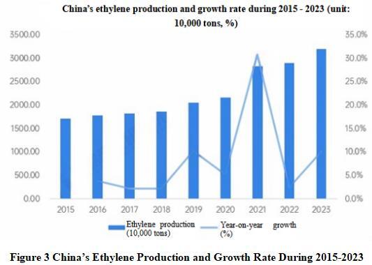 According to the latest data from the National Bureau of Statistics, China’s ethylene production in 2022 was 28.975 million tons, with a year-on-year increase of 2.5%; In 2023, the ethylene production was 31.898 million tons, with a year-on-year increase of 10.1%.