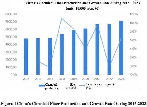 According to the latest data from the National Bureau of Statistics, the overall production of chemical fibers in China has shown an upward trend during 2015- 2023. In 2023, China’s chemical fiber production reached 71.27 million tons, with a year-on-year increase of 6.4%.