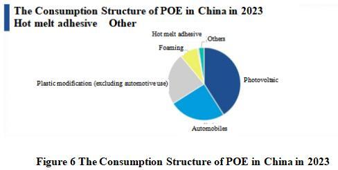 During 2017- 2023, China’s POE consumption maintained rapid growth, with domestic POE consumption increasing from 220,000 tons during 2017- 860,000 tons in 2023, with an average annual compound growth rate of 25.1%. The largest downstream consumer sector is the photovoltaic sector, accounting for 41% of domestic POE consumption and showing a rapid growth trend, followed by the automotive sector and plastic modification (excluding automotive use).