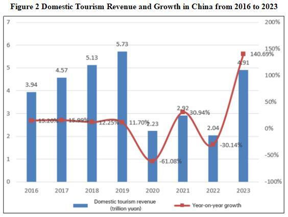 In 2023, the domestic tourism revenue (total travel expenses) reached 4.91 trillion yuan, an increase of 2.87 trillion yuan from the previous year, a year-on-year growth of 140.69%, a significant increase, reversing the sluggish situation since 2020. At the same time, compared with 2019 before the pandemic, the domestic tourism revenue in 2023 has recovered to 85.69% of the same period in 2019, significantly narrowing the gap and demonstrating the vitality and potential of domestic tourism consumption. In 2023, the total travel expenses of domestic tourists in China were 4178.1 billion yuan for urban residents, an increase of 147.5%; rural residents spent 735.3 billion yuan on travel, an increase of 106.4%. The total cost of inbound tourists was 53 billion US dollars.