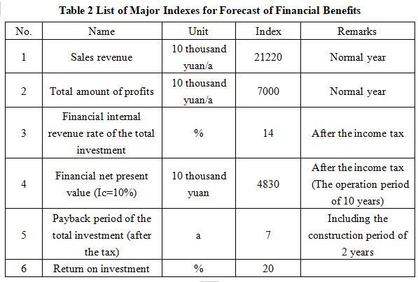 After the project reaches the production capacity, its annual sales income will be 212.2 million yuan, its profit will be 70 million yuan, its investment payback period will be 7 years (after the tax, including the construction period of 2 years) and its investment profit rate will be 20%.