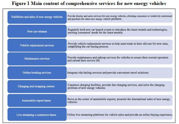 The comprehensive services for new energy vehicles mainly include exhibitions and sales, new car releases, vehicle replacement services, maintenance services, online booking services, charging and swapping centers, automobile export bases, and live streaming e-commerce bases.