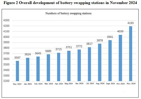 In recent years, significant progress has been made in the development of battery swapping stations in China. Policies on battery swapping stations have been successively introduced in various provinces and cities, and station construction has received numerous supports, achieving rapid development. According to statistics from the China Charging Alliance, as of November 2024, a total of 4193 battery swapping stations have been reported by member units within the Alliance.
