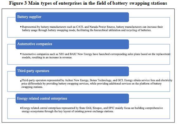 The main enterprises in the field of battery swapping stations include battery suppliers, automotive companies, third-party operators, and energy related central enterprises.