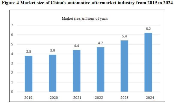 Data shows that the market size of China's automotive aftermarket industry has reached 5.4 trillion yuan in 2023, with a CAGR of 9.2% from 2019 to 2023. The market size of China's automotive aftermarket industry is reached about 6.2 trillion yuan by 2024.
