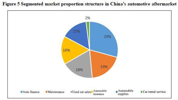 At present, automotive finance is the largest segmented market in the automotive aftermarket. According to relevant data, the automotive finance market has the largest proportion in the automotive aftermarket, reaching 29%, making it the largest segmented market in the automotive aftermarket; Followed by maintenance, used cars sales, automobile insurance, automobile supplies, and car rental services, accounting for 19%, 18%, 16%, 15%, and 2% respectively.