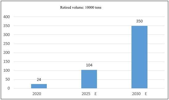 With the rapid development of China's new energy vehicle industry, the retirement amount of power batteries will also increase year by year. Data shows that in 2020, a total of 240000 tons of retired power batteries were produced nationwide. It is predicted that China's retired power batteries will reach 1.04 million tons by 2025 and 3.5 million tons by 2030.