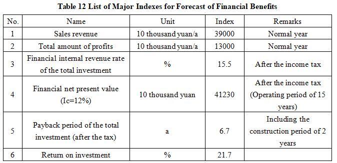After the project reaches the production capacity, its annual sales income will be 390 million yuan, its profit will be 130 million yuan, its investment payback period will be 6.7 years (after the tax, including the construction period of 2 years) and its investment profit rate will be 21.7%.