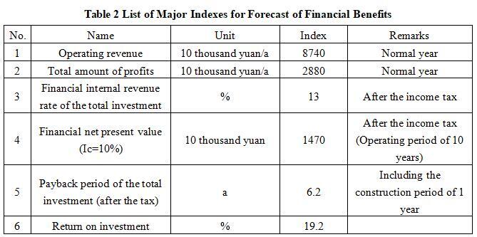 After the project reaches the production capacity, its annual sales income will be 87.4 million yuan, its profit will be 28.8 million yuan, its investment payback period will be 6.2 years (after the tax, including the construction period of 1 year) and its investment profit rate will be 19.2%.
