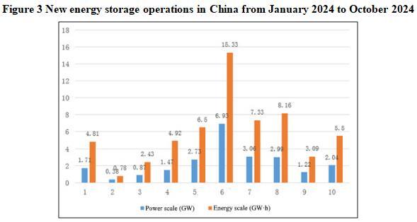 As of the end of October 2024, the cumulative installed capacity of China's new energy storage market in 2024 was 23.42GW/58.86GW·h, a year-on-year increase of 118% (based on energy scale). The scale of project operation doubled compared to the same period last year. With the considerable overall growth rate, the industry continues to improve and gradually mature. In October 2024, the newly installed capacity of new energy storage was 2.04GW/5.50GW·h, an increase of 82% month on month (based on energy scale), while the scale still increased by 236% compared to the same period last year (based on energy scale).