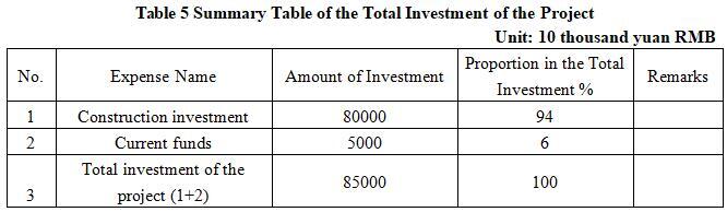 The total investment of the project is 850 million yuan, including a construction investment of 800 million yuan and a working capital of 50 million yuan.