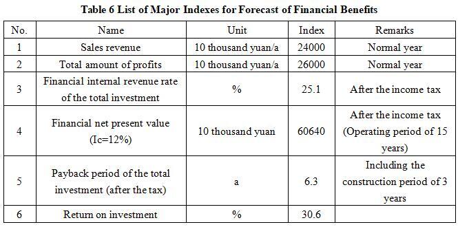 After the project reaches the production capacity, its annual sales income will be 2.4 billion yuan, its profit will be 260 million yuan, its investment payback period will be 6.3 years (after the tax, including the construction period of 3 years) and its investment profit rate will be 30.6%.