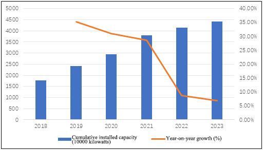 Figure 1 Cumulative installed capacity and year-on-year growth rate of biomass power generation in China from 2018 to 2023