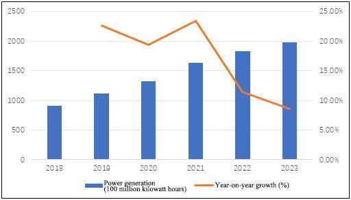Figure 2 Biomass power generation and year-on-year growth rate in China from 2018 to 2023