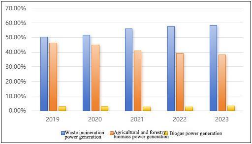 Figure 4 Cumulative installed capacity proportion of various biomass power generation from 2019 to 2023