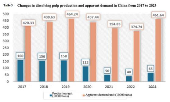 The production of dissolving pulp in China remained relatively stable from 2017 to 2019, maintaining above 1.5 million tons; Subsequently, due to factors such as the epidemic, insufficient wood supply capacity, high prices, and stricter environmental policies, the production of dissolving pulp in China has significantly declined, reaching 400000 tons in 2022, a year-on-year decrease of 20%; In 2023, with the increase of Chinese timber supply and the improvement of downstream demand for viscose staple fiber, its production has rebounded to 650000 tons, a year-on-year increase of 62.50%. Meanwhile, driven by downstream markets, the overall apparent demand for dissolving pulp in China remains above 3.7 million tons. After experiencing a two-year decline, the apparent demand rebounded in 2023, reaching 4.6164 million tons, a year-on-year increase of 23.19%.