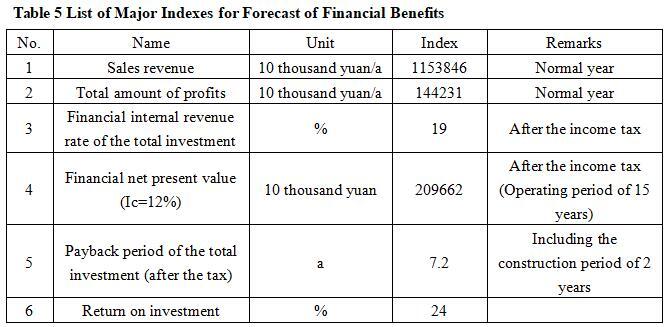 After the project reaches the production capacity, its annual sales income will be 11.53846 billion yuan, its profit will be 1.44231 billion yuan, its investment payback period will be 7.2 years (after the tax, including the construction period of 2 years) and its investment profit rate will be 24%.