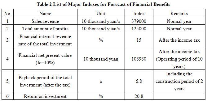 After the project reaches the production capacity, the annual sales revenue is 3.79 billion yuan, the profit is 1.25 billion yuan, the investment payback period is 6.8 years (after the tax, including the construction period of 2 years), and the investment profit rate is 20.8%.
