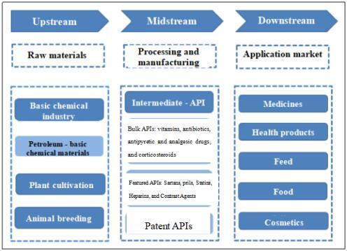 The API industrial chain covers the upstream basic chemical industry, agriculture, forestry, animal husbandry, and fishery industries, mainly including basic chemical engineering, plant cultivation, animal husbandry, and preparation of some medicine intermediates; The API production in the midstream, including the preparation of APIs through chemical synthesis, animal and plant extraction, microbial fermentation, or other modern biotechnology methods; and multiple downstream links such as production of chemical preparations, etc.