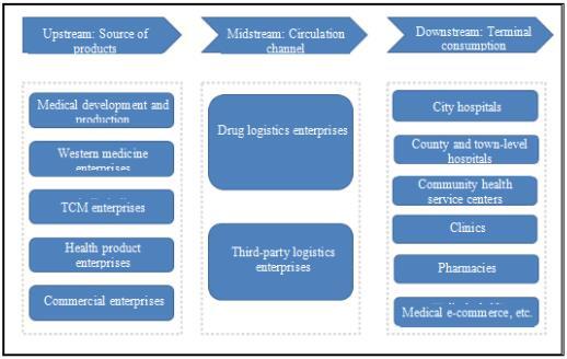 In the medicine logistics industrial chain, it mainly involves industry supply enterprises, medicine logistics enterprises, and drug consumption terminals. Among which, the upstream links mainly include the drug production and commercial enterprises; The midstream link is the circulation link of drugs, mainly including the drug logistics enterprises, which can be divided into internal subsidiaries affiliated with drug groups and third-party logistics enterprises; The medical consumption terminals refer to the users of drugs, mainly including hospitals at all levels, basic medical institutions, and retail pharmacies, etc. across the country.