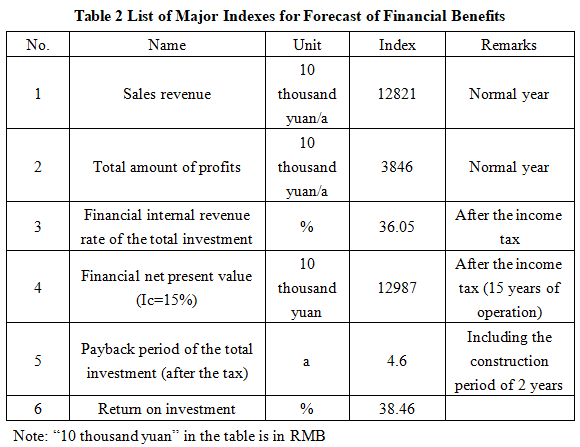 After the project reaches the production capacity, its annual sales income will be 128.21 million yuan, its profit will be 38.46 million yuan, its investment payback period will be 4.6 years (after the tax, including the construction period of 2 years), and its return on investment will be 38.46%.
