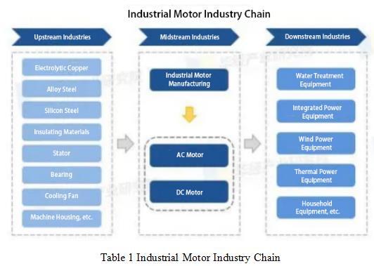 The upstream raw materials of industrial motors include electrolytic copper, alloy steel, silicon steel, insulation materials, etc., as well as suppliers of components such as stators, tail shafts, bearings, cooling fans, and casings; the mid-stream is industrial motor manufacturing; the downstream is the application fields of industrial motors, including water treatment equipment, power equipment, wind power equipment, thermal power equipment, and household equipment.
