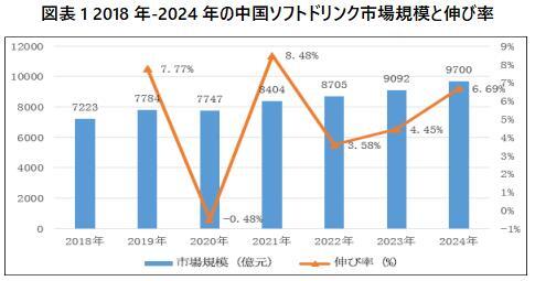 中国の製品カテゴリー別の即席ソフトドリンク市場規模は年々安定的に上昇し、増加傾向を呈している。2018年の中国の即席ソフトドリンク市場規模はすでに7223億元に達した。2020年末から2021年初めまでは当該業界の前年比伸び率が最も速い段階で、2021年の前年比伸び率は8.48%に達した。2023年の中国の即席ソフトドリンク市場規模はすでに9092億元に達した。2024年の中国の即席ソフトドリンク市場規模は9700億元に達した。