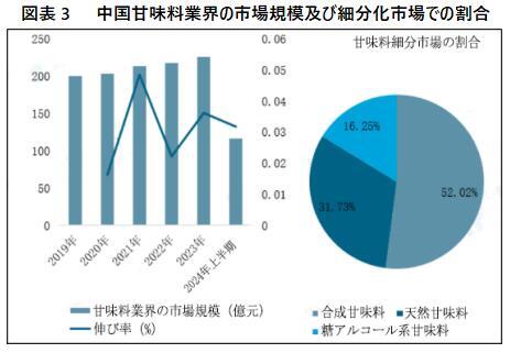 甘味料とは、食品に甘味を与えることができる食品添加物を指す。現在、世界的に広く使われている甘味料は、天然由来のものや人工合成のものなど、数十種類ある。中国が使用を許可した20種類は、いずれも世界のほとんどの国と地域で使用が許可されている甘味料であり、アスパルテーム、アンサイ蜜、サッカリン、スイートエッセンスなどで、長期にわたって安全に使用されてきた歴史がある。近年、人々の健康意識の高まりと低糖類、無糖食品への需要の増加に伴い、中国甘味料業界の発展の勢いは強い。統計によると、2023年の中国における甘味料市場規模は2019年の200億元から225.69億元に増加し、2024年上半期は前年同期比3.16%増の116.41億元に達した。細分化市場を見ると、2022年に合成甘味料の市場シェアは52.02%で、天然甘味料と糖アルコール系甘味料がそれぞれ31.73%と16.25%のシェアである。現在、合成甘味料は依然として市場の主導的な地位を占めているが、健康的な飲食理念の普及に伴い、天然甘味料はその源が自然で、健康への影響が小さいため、ますます多くの消費者の愛顧を受けている。将来的には天然甘味料の市場シェアは上昇し続け、甘味料市場の重要な成長点になると予想されている。