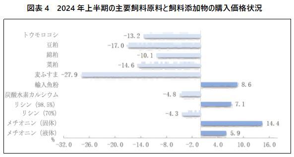2024年上半期、トウモロコシ、豆粕などの主要飼料原料の価格は大幅に回復した。飼料企業のトウモロコシ、豆粕の購入平均価格はそれぞれ2524元/トン、3680元/トンで、前年同期よりそれぞれ13.2%、17.0%ダウンした。粕類の価格比効果により、綿粕、菜粕の価格はそれぞれ3746元/トン、2841元/トンで、前年同期よりそれぞれ10.1%、14.6%下落した。2023年のペルー漁獲停止の影響で、輸入魚粉の価格は引き続き上昇し、上半期の購入平均価格は14697元/トンで、前年同期比8.6%上昇した。アミノ酸市場は上昇が主とし、ビタミン、鉱物元素は弱い勢いで運行している。
