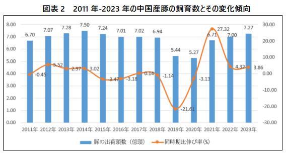 2020年の豚高価格による高利益の激励の下で、2021年、中国における生豚養殖業は急速に拡大し、養殖規模は大幅に増加し、豚肉の生産量は明らかに上昇し、豚肉の価格は大幅に下落し、一部の生豚養殖企業は赤字になったり倒産したりした。2022年、国内の豚生産能力は引き続き解放され、豚肉生産量は増加傾向を維持したが、去年の業界の大幅な赤字を背景に、2022年の全国の豚肉生産量の増加幅は明らかにスピードダウンした。国家統計局の統計データによると、2023年の全国豚肉生産量は5794万トンで、前年同期比4.57%増え、近年のピーク生産量(2014年、5820.8万トン)の回復まで26.8万トンの差がある。