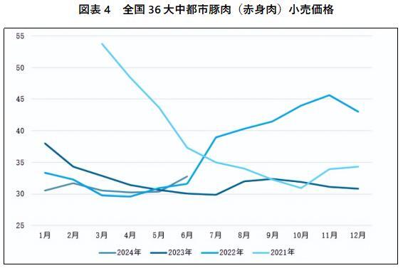歴史化の過程、政策の導きと疫病の後押しに伴い、生豚業界の集中度が向上し、多くの小規模養殖場が2018年の豚コレラの中でアウトになり、業界の集中度の向上の過程を加速した。同時に、中国における生豚飼育数の下落幅は絶えず拡大し、豚の価格は大幅に上昇し、豚サイクルは上昇し、「スーパーピッグサイクル」をもたらした。しかし、2021年に入り、生豚の飼育数の回復と市場需要の相対的な下落に伴い、豚肉価格は下降道に入り始めた。豚の周期の変化に伴い、ここ2年は新旧豚の周期が代替えする過渡期である。この段階では生産能力は十分に解消されておらず、価格は低位置で揺れ動いている段階にある。2024年6月、全国36の大中都市の豚肉(赤身肉)の小売価格は32.76元/kgで、前月比2.42元/kg増加し、前年同期比2.68元/kg増加した。