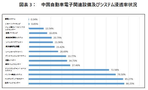 現在、自動車電子産業はバックレーダー、マルチメディアモニター、パノラマ映像システム、クルージングシステムなど多くのセグメント分野をカバーしている。 浸透率からみると、バックレーダーの浸透率が最も高く、86.25%に達している。その次に、センター・コンソール・ディスプレイが85.57%、パノラマ映像システムが78.50%、クルージングシステムが72.58%であり、その以外のセグメント市場における浸透率は比較的低く、多くは40%以下であるため、大きな市場拡大のスペースがある。