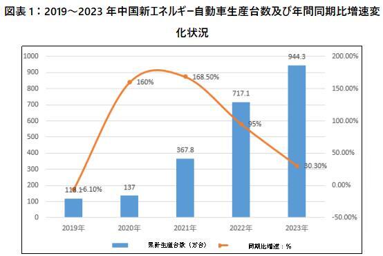 新エネルギー自動車は世界の自動車産業のシフトやアップグレード、クリーンな発展の主要な方向であり、中国が新たな生産力の形成を加速させ、自動車産業の高品質発展を推進するための戦略的選択でもある。ここ5年間、2019年から2023年にかけて、中国の新エネルギー自動車生産台数は年々増加している。 2019年、中国の新エネルギー自動車生産台数は約118.1万台で、前年同期比6.1%減少した; 2021年、その生産台数は367.8万台までに増加し、前年同期比168.5%増加した;2023年、中国の新エネルギー自動車生産台数は944.3万台までに増加し、前年同期比30.3%増加した。