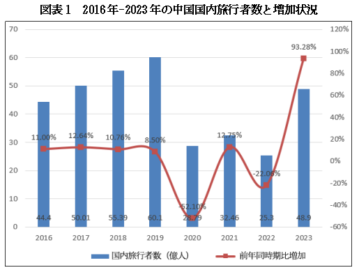 2023年は観光業界が勢いよく回復した年で、抑圧されていた3年間の旅行需要が解放され、旅行は徐々に人々のライフスタイルとなり、国民の旅行ブームを巻き起こしている。国家統計局が発表した「中華人民共和国2023年国民経済・社会発展統計公報」によると、2023年の年間国内旅行者は延べ48.9億人で、前年比93.3%増えた。そのうち、都市部住民の国内旅行者は延べ37.6億人で、94.9%伸びた。農村住民の国内旅行者数は延べ11.3億人で、88.5%増である。入国観光客は延べ8203万人、うち外国人は延べ1378万人、香港、マカオ、台湾同胞は延べ6824万人である。国内住民は延べ10096万人が海外へ行き、うち私用出国は延べ9684万人、香港・マカオ・台湾へは延べ7704万人が出向いた。