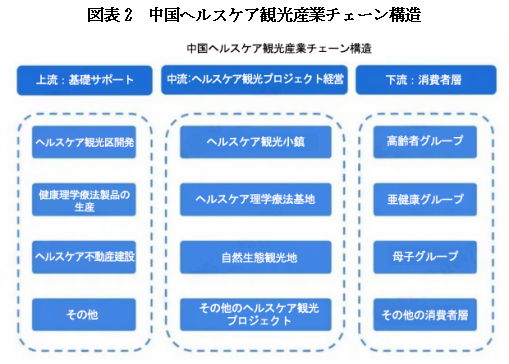 産業チェーンの角度から、ヘルスケア観光産業チェーンは上流の不動産開発投資、計画建設、中流のヘルスケア旅行プロジェクト運営者、下流のプロジェクト普及ルート業者を含む。ヘルスケア観光プロジェクトのライフサイクルは、「開発-計画設計-建設-運営」のチェーンに沿って発展・延びている。