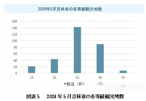 吉林省は8つの地級市、1つの自治州を管轄している。その中でA級観光地が最も多いのは通化市で、2024年5月現在のA級観光地の数は62軒に達した。吉林省通化市の観光特色は主にその豊かな文化遺産、自然風景、氷雪スポーツ、紅色観光などの面で体現されている。A級観光地数の2位は延辺朝鮮族自治州で、A級観光地は56カ所あり、その典型的な代表は長白山観光地である。