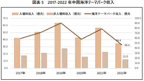 海洋テーマパークはテーマパーク業界における重要なジャンルの一つとして、近年国内市場でブームを迎えている。一般的なテーマパークと異なり、海洋テーマパークは独自の海洋資源、ビジネスモデル、産業チェーンを有しており、そのうち2022年の中国海洋テーマパークの収入は46.4億元、入場料収入類は34.41億元、非入場料収入は12億元である。