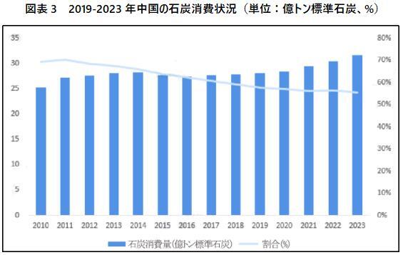 2010年以来、全国の石炭消費量は持続的に増加し、2022年には30億トンの標準石炭を突破し、2023年には31.63万億トンの標準石炭に達した。全国のエネルギー消費全体の状況を見ると、石炭は依然として主要な消費エネルギーであるが、その割合は近年低下傾向にあり、2010年の69.2%から2023年の55.3%に下がった。