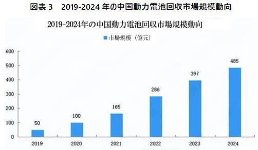 2023年の中国動力電池回収市場規模は397億元。動力電池は一般的に5-8年の使用寿命を有しており、2020-2022年の第2サイクルに基づいて推計すると、2025年前後に新たな動力電池の退役ブームが発生する見込みである。同時に、最近国務院が打ち出した「新旧置換」補助政策を重ね合わせると、動力電池回収業界は大きな需要を迎える見込みである。2024年の中国動力電池回収市場規模は480億元を超える。