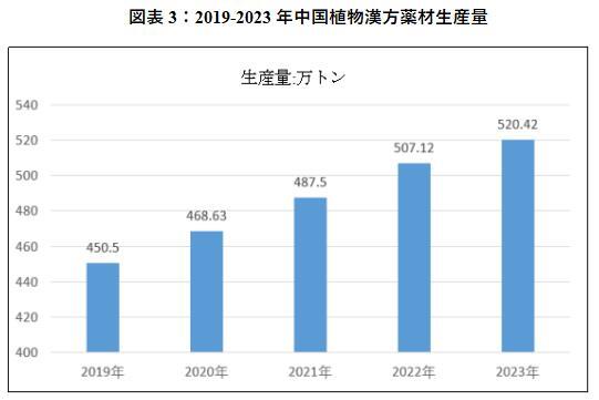 ここ数年来、中国の漢方医薬業界に対する支援力は絶えず強化され、漢方薬材栽培基地建設の資金支援、漢方薬材栽培農家への補助金など、一連の支援政策が打ち出された。これらの政策は漢方薬材栽培業界の発展に良好な環境を作っている。人々の健康意識向上、漢方医薬の受入れ度が向上しつつある中、国内市場における漢方薬材の需要増が続いている。特に高齢化社会への急速な移行につれ、漢方薬材のニーズ増に拍車をかけている。2019-2023年中国における漢方薬材の販売量は444.00万トンから約505.64万トンに増加した。